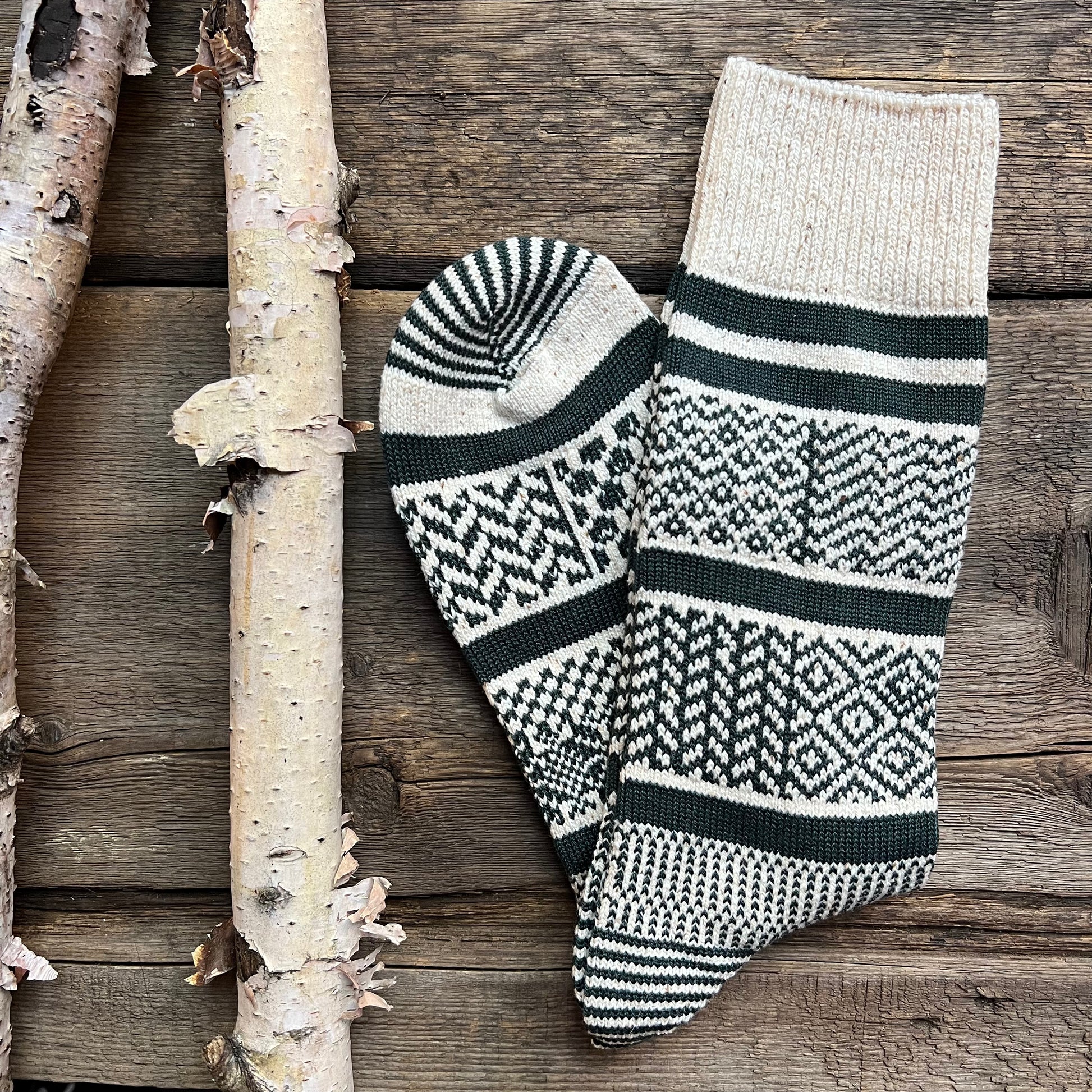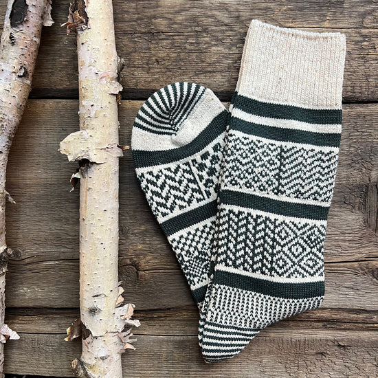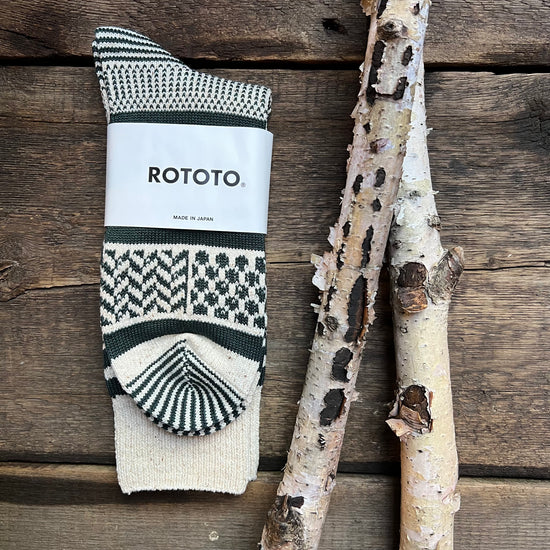 - The design of these jacquard socks is inspired from traditional fairisle sweaters crafted in Fair Isle, Scotland. The geometric pattern is carefully and finely knitted for a warm, hand-knitted-like appearance. Each color combination is selected by referring traditional designs, but we try to make it light to brighten up the foot. Although fairisle sweaters are originally made of wool, this pair is knitted with organic cotton for year-round use. Organic cotton yarn used for this item is produced by a unique fuzz-resistant spinning method and is called ‘compact yarn.’