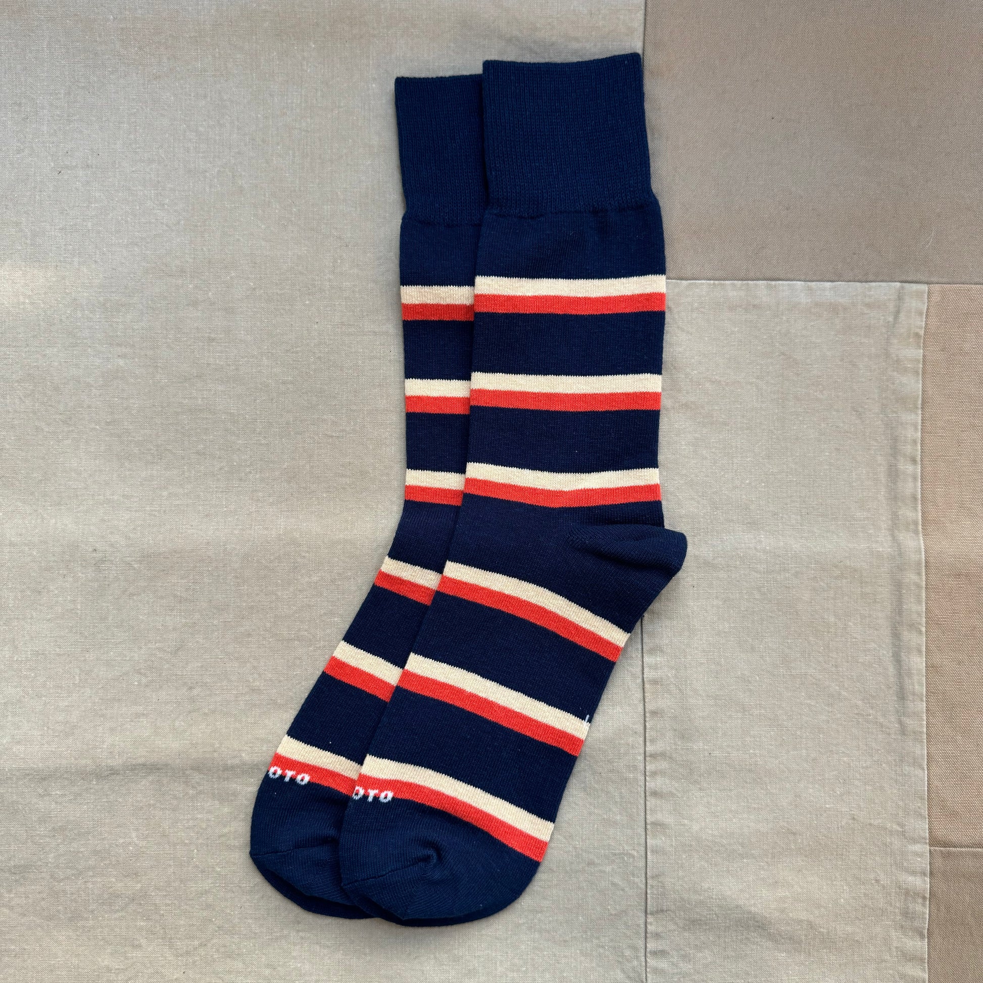 - The fabric of this item is designed with inspiration from a densely-woven rugby shirt. Each sock is knitted with Raffy yarn, uneven yarn produced by combining long staple cotton with cotton waste. To maintain the unique uneven feel, the yarn is slowly spun at Japanese factories with a spinning method that has not been changed for over 50 years. The irregular surface is not seen on modern mass-produced products and has rich texture.