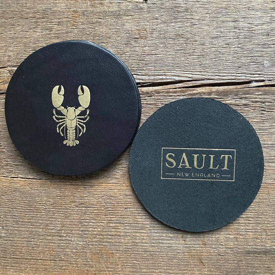 - Coasters stamped with a Gold Foil Lobster, Sault on the backside in gold print..