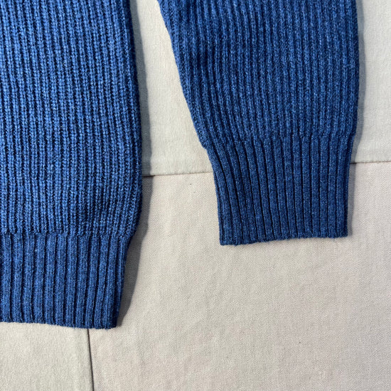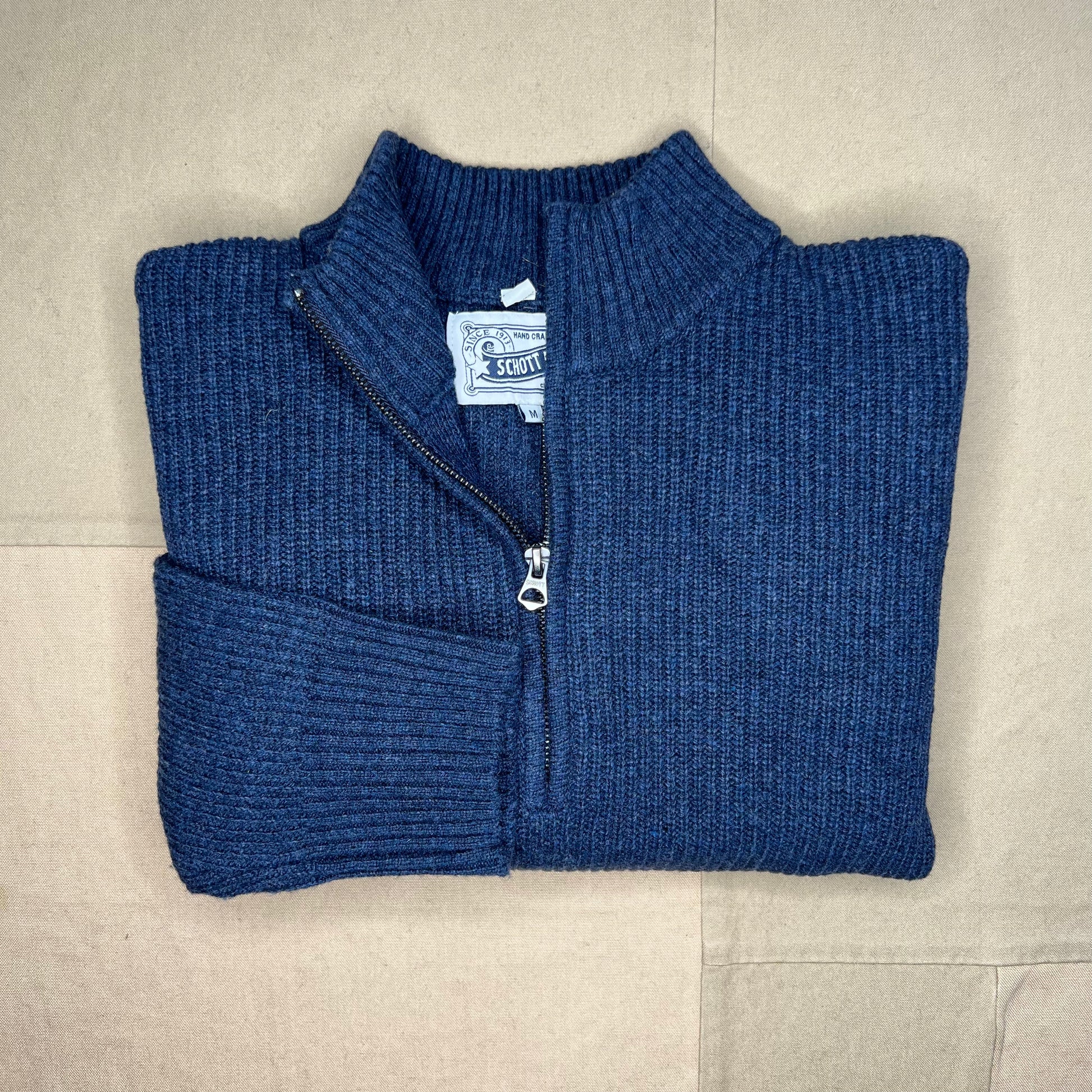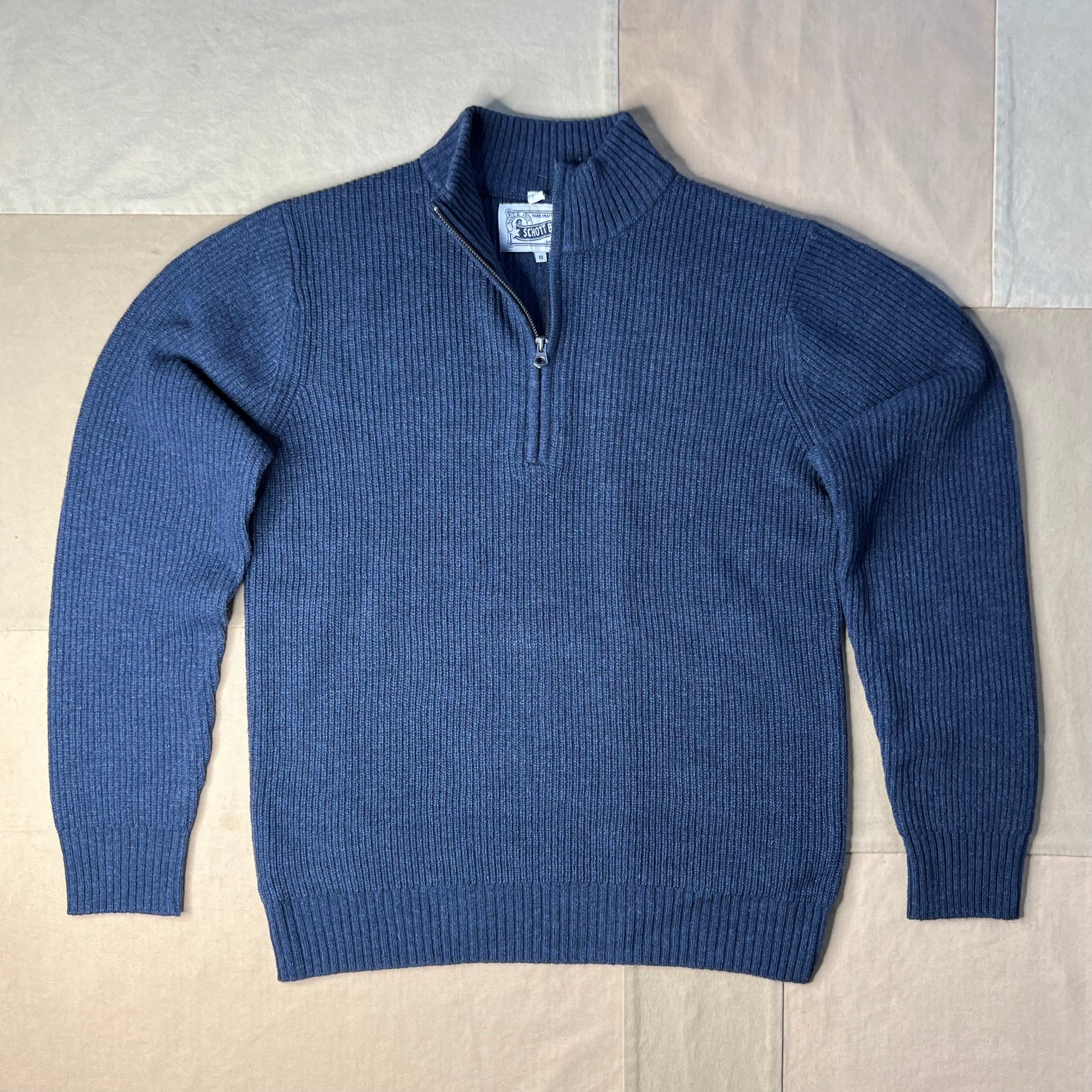 Midweight wool blend ribbed knit sweater with 1/2 zipper pull.
